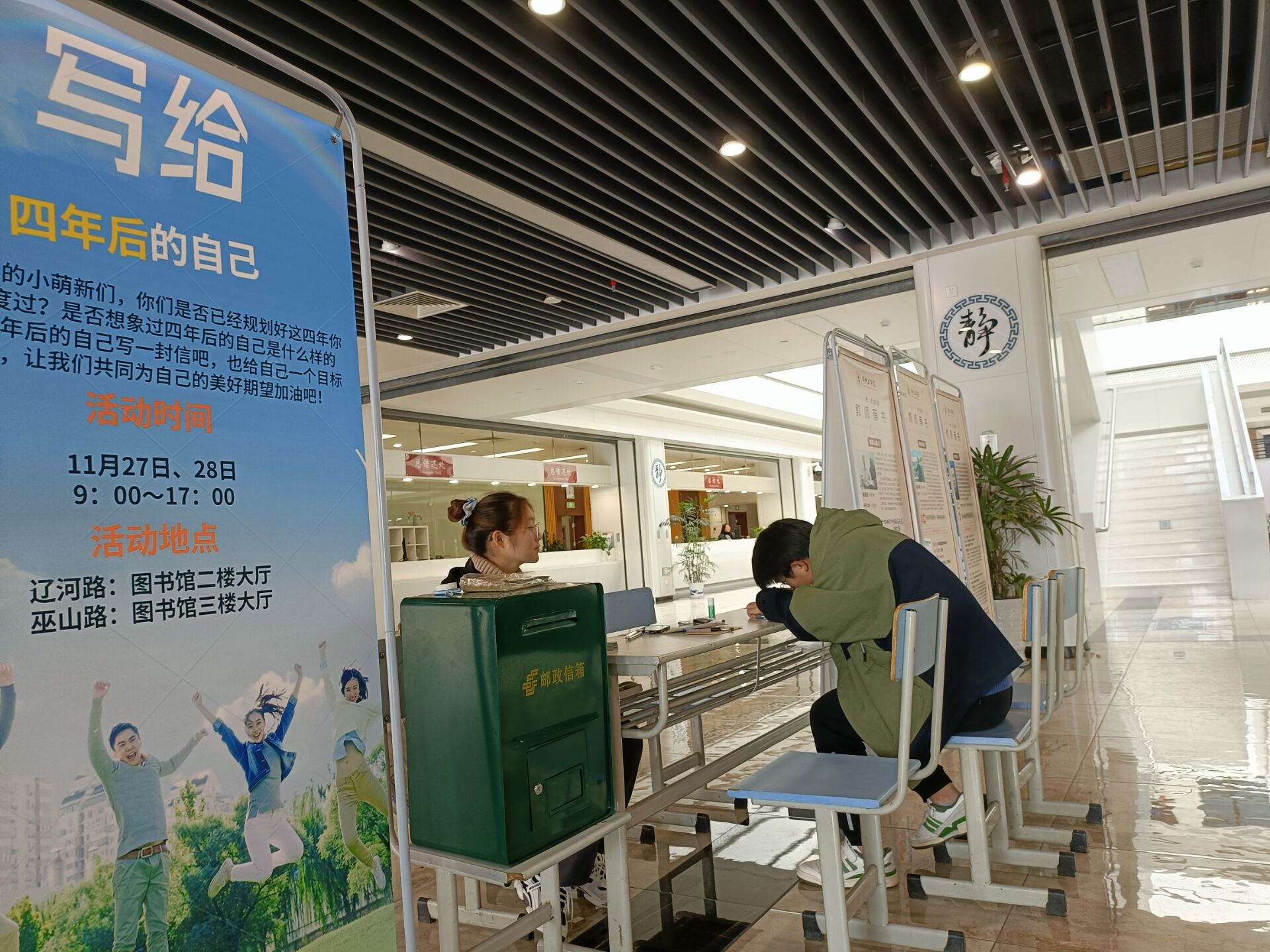 2021年11月27日至11月28日,明湖书社分别在辽河路校区图书馆二楼大厅和巫山路校区图书馆一楼大厅同时举行“写给四年后的自己”活动,共有一百多名同学积极参与。