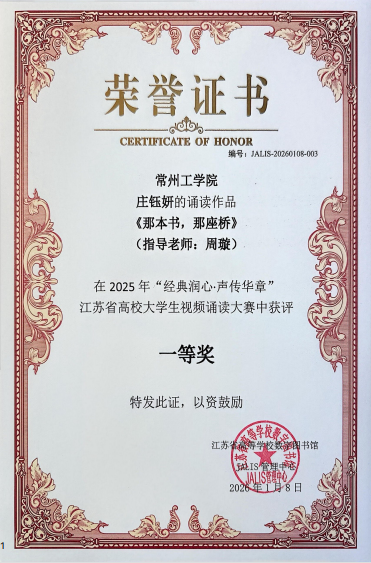 在刚刚落幕的“经典润心·声传华章”江苏省高校大学生视频诵读大赛中,图书馆指导选送的原创作品《那本书,那座桥》,在全省25所高校333件作品中脱颖而出,荣获一等奖。